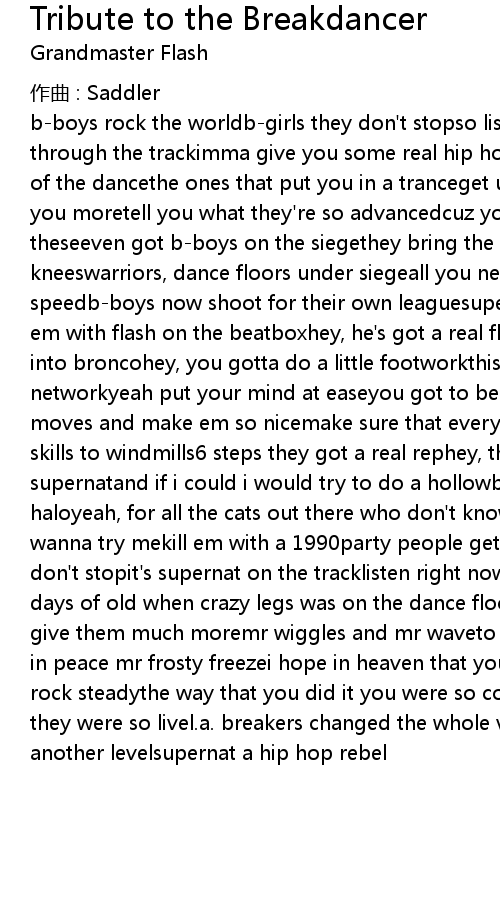 | b-boys rock the worldb-girls they don't stopso listen to supernat as i bust through the trackimma give you some real hip hopwe gonna talk about the muscles of the dancethe ones that put you in a tranceget up on the dance floor and give you moretell you what they're so advancedcuz you never seen styles like theseeven got b-boys on the siegethey bring the crowd straight to they kneeswarriors, dance floors under siegeall you need is agility and a little speedb-boys now shoot for their own leaguesupernat this is another heat rockkill em with flash on the beatboxhey, he's got a real flowget on the dance floorbust into broncohey, you gotta do a little footworkthis is for the real b-boy networkyeah put your mind at easeyou got to be flossy when you freezedo power moves and make em so nicemake sure that every float is precisehey, from hand skills to windmills6 steps they got a real rephey, this is the cat called the supernatand if i could i would try to do a hollowbackor scorpion, a headspin, a haloyeah, for all the cats out there who don't knowand get on the mic if you wanna try mekill em with a 1990party people get funky funkysaid the hip hop don't stopit's supernat on the tracklisten right now we'll bring that backto the days of old when crazy legs was on the dance floorway that he rocked he would give them much moremr wiggles and mr waveto be a b-boy, yo you must be braverest in peace mr frosty freezei hope in heaven that you're so at easehey do it for rock steadythe way that you did it you were so committednew york city breakers they were so livel.a. breakers changed the whole vibeair force crew took it to another levelsupernat a hip hop rebel |