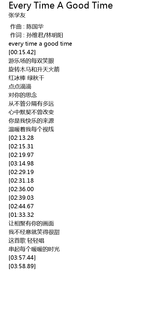 | [03:44.60][03:14.98][02:22.72][01:02.13] | 有你在every time a good time |