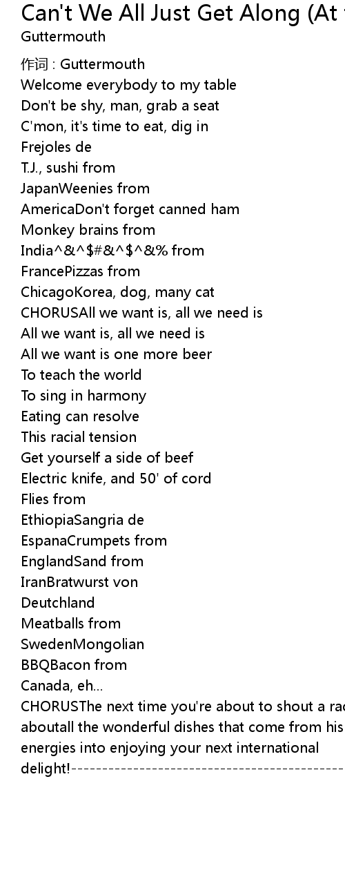 | CHORUSThe next time you' re about to shout a racial slur, stop, and think aboutall the wonderful dishes that come from his or her country, and channelyour energies into enjoying your next international delight! |