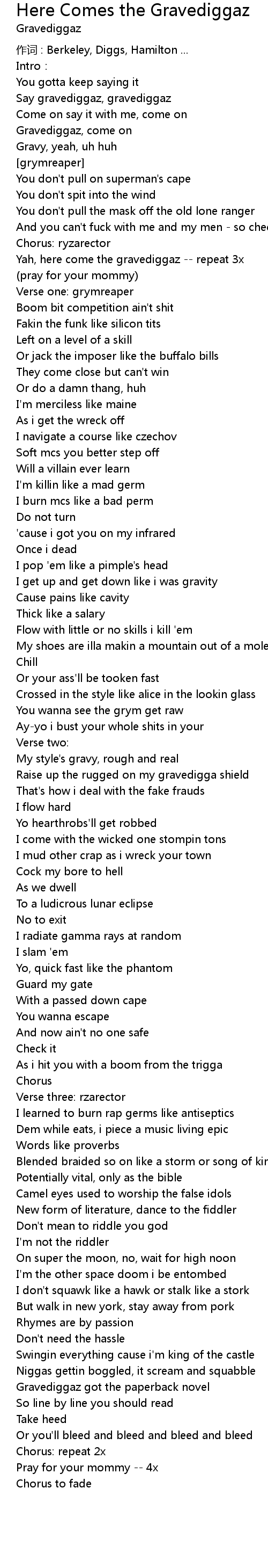 | Yah, here come the gravediggaz -- repeat 3x | |