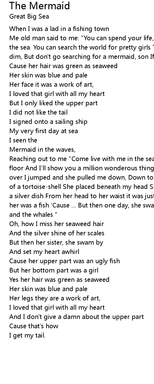Me old man said to me: "You can spend your life, your jolly life Just sailing on the sea. You can search the world for pretty girls Til your eyes are weak and dim, But don't go searching for a mermaid, son If you don't know how to swim" ' |