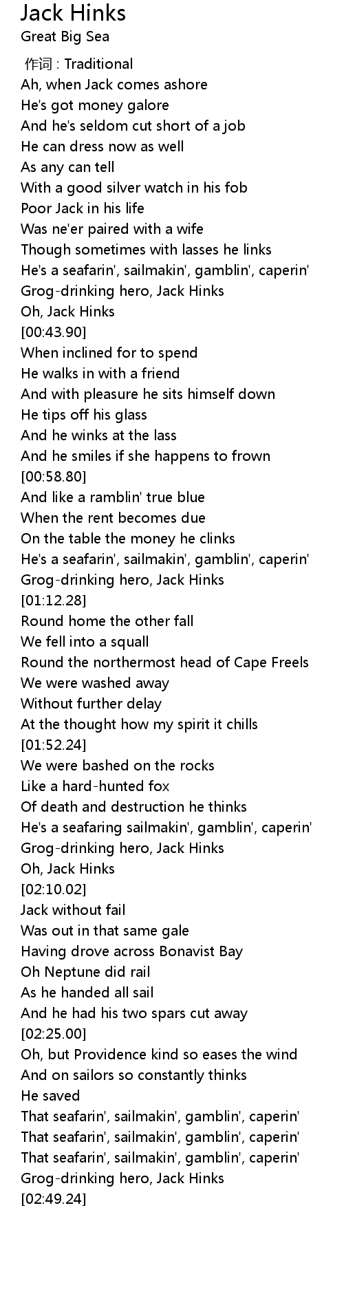 | [00:12.53] | Ah, when Jack comes ashore |
