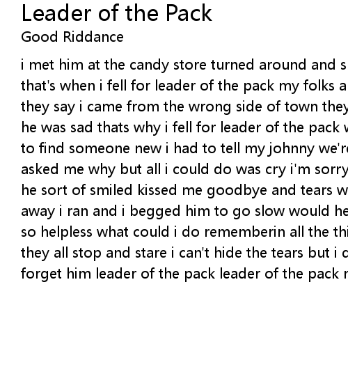 i met him at the candy store turned around and smiled at me get the picture that's when i fell for leader of the pack my folks are always putting me down they say i came from the wrong side of town they told me he was bad but i know he was sad thats why i fell for leader of the pack well the day my dad told me to find someone new i had to tell my johnny we're through he stood there and asked me why but all i could do was cry i'm sorry i hurt you leader of the pack he sort of smiled kissed me goodbye and tears were beginning to show as he drove away i ran and i begged him to go slow would he hear me i'll never know i felt so helpless what could i do rememberin all the things we been through at school they all stop and stare i can't hide the tears but i don't care i'll never forget him leader of the pack leader of the pack now he's all gone |