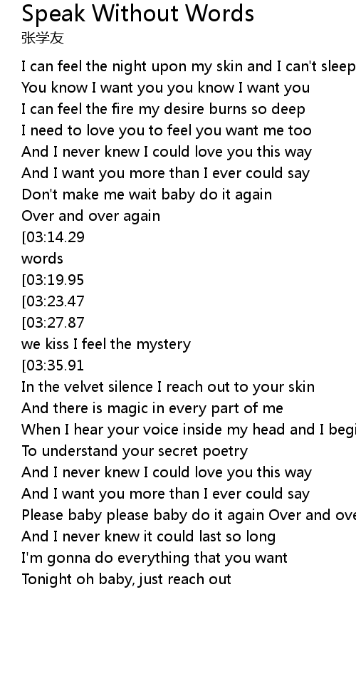 [04:14.08][03:27.87][02:29.22][01:16.00] Speak without Speak without words When we kiss I feel the mystery