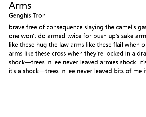 | brave free of consequence slaying the camel's gash pine marks his passing well one won't do armed twice for push up's sake arms like these swing a state arms like these hug the law arms like these flail when our songs hit a desert bride arms like these cross when they're locked in a draped pine box shock, it's a shock—trees in lee never leaved armies shock, it's a shock these trees shock, it's a shock—trees in lee never leaved bits of me it's a shock, it's a shock |