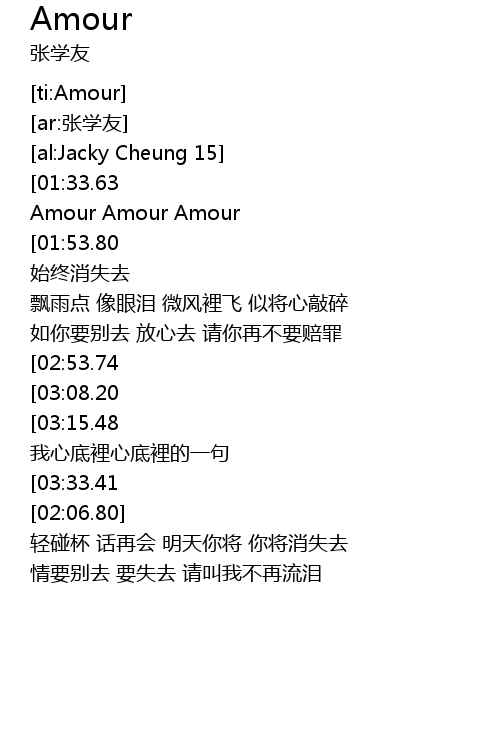 | [00:20.68][01:33.63][01:46.96][03:24.10][03:40.33][03:53.70] | Amour Amour Amour Amour Amour Amour |