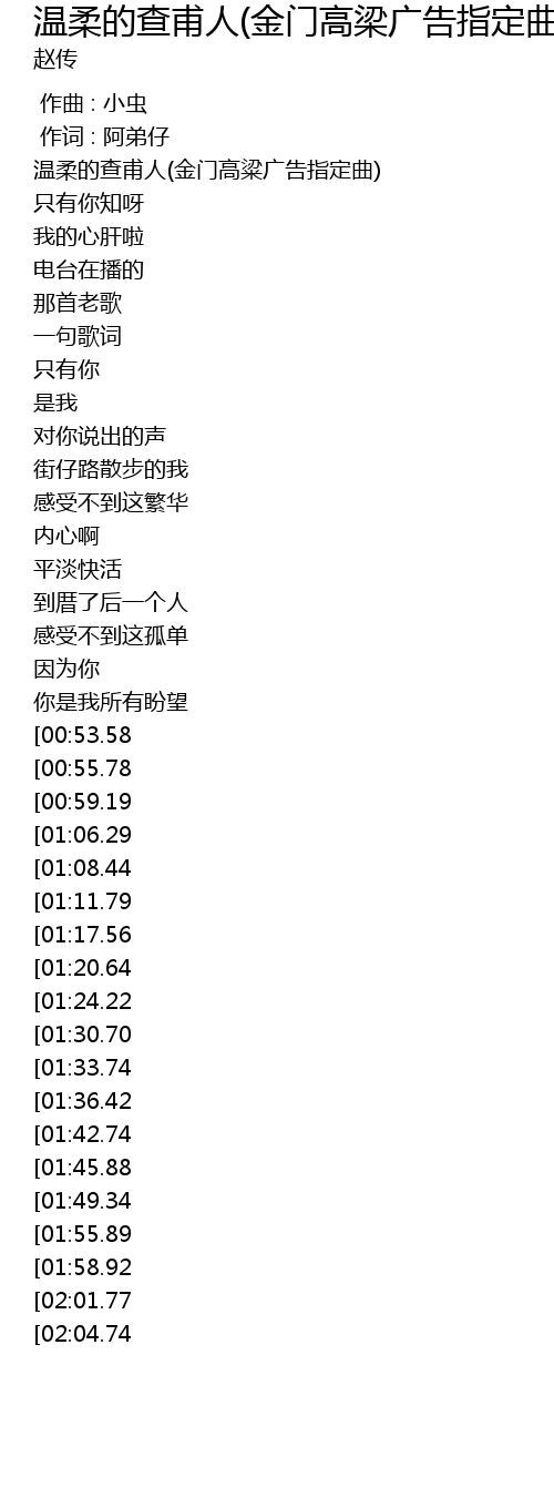 | [00:00.00] | 温柔的查甫人(金门高粱广告指定曲) |
