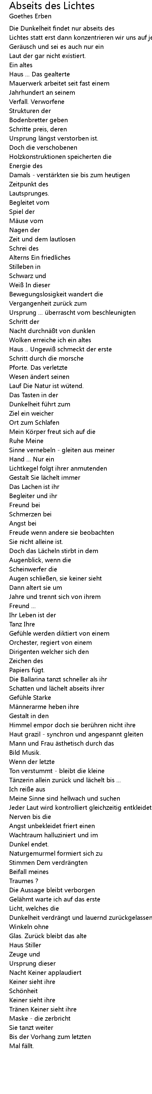 | Jeder Laut wird kontrolliert gleichzeitig entkleidet er lichtlos meine | |