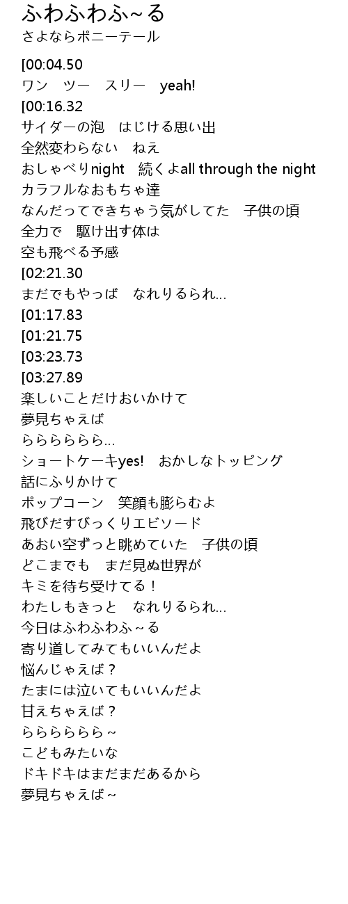 | [01:01.27][01:17.83][03:16.06] | みんなふわふわふ~る |