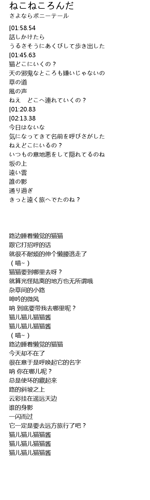 | [01:17.02][01:20.83][02:49.96][02:54.19][02:57.92] | ねこねこねこちゃん |