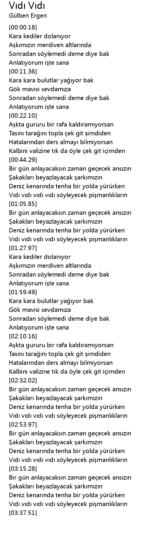 | [03:31.70] | Vıdı vıdı vıdı vıdı söyleyecek pişmanlıkların |