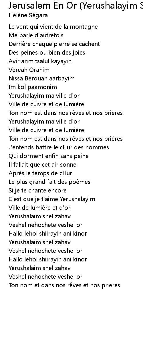 | Song | Jerusalem En Or (Yerushalayim Shel Zahav) |