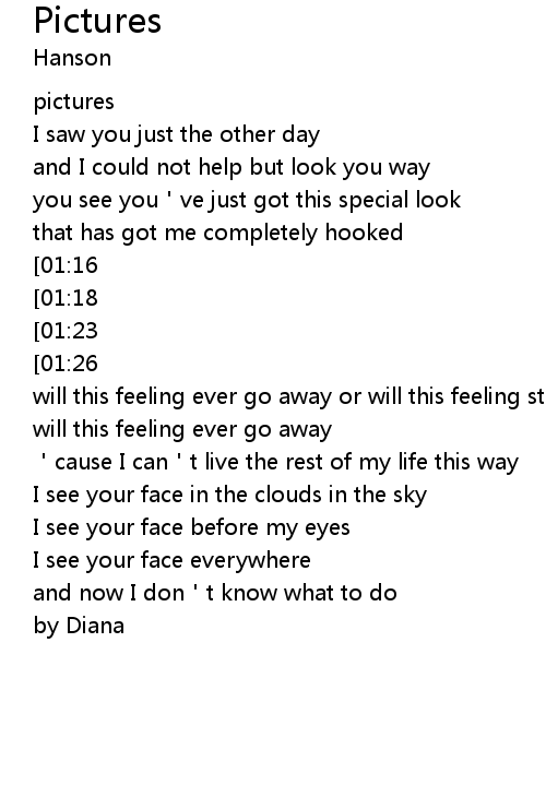 | [01:52][01:18][00:45] | pictures on the wall,everywhere I stare |