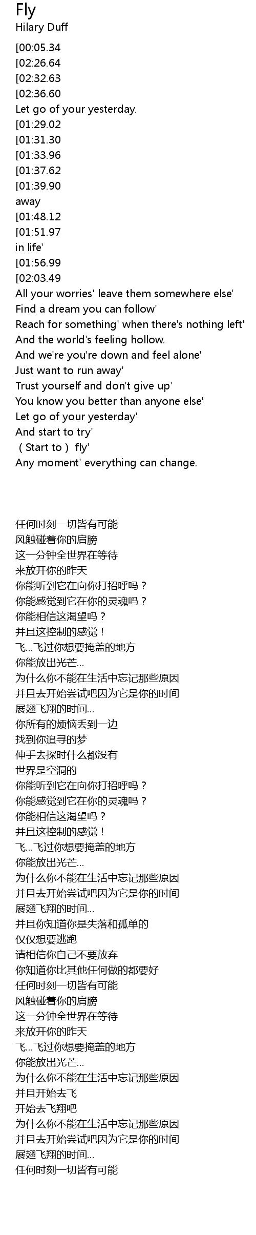 | [00:37.67][01:39.90][02:47.28] | Fly over up the part of you that wants to hide away |