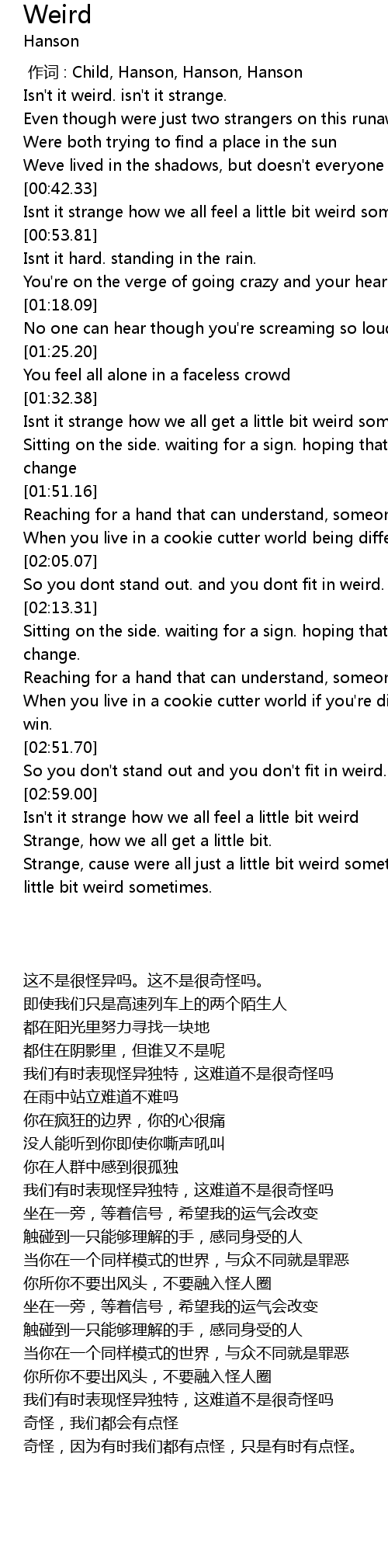 | [03:17.21] | Strange, cause were all just a little bit weird sometimes.just a little bit weird sometimes. |