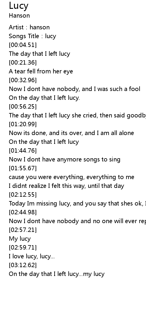 | [02:22.58] | Today Im missing lucy, and you say that shes ok, I hope she is. |