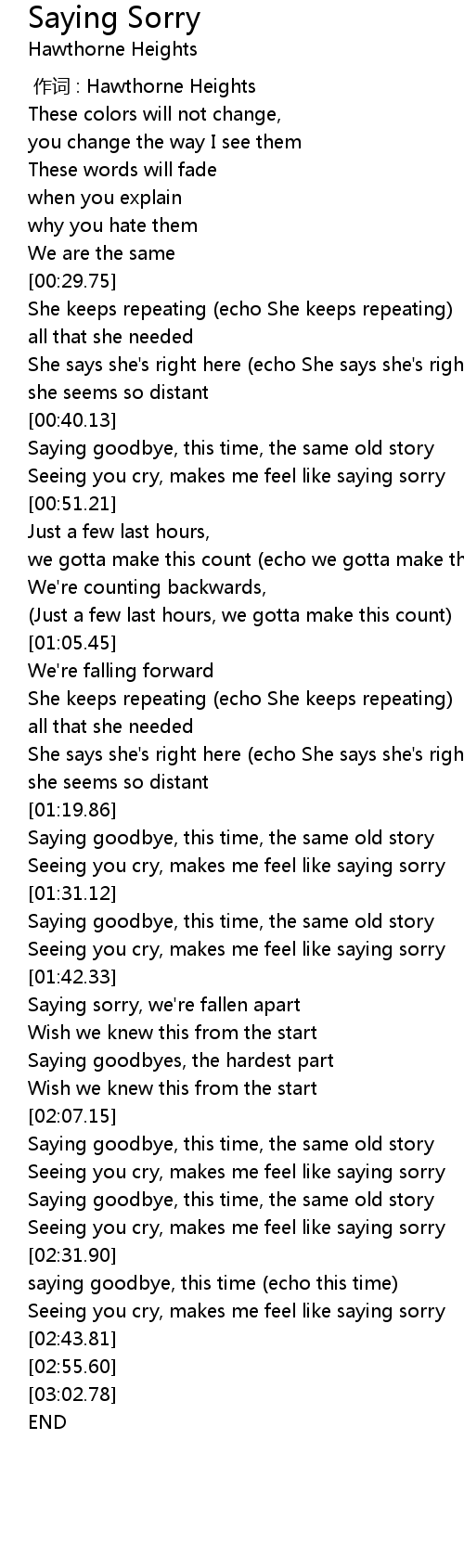 | [00:46.32] | Seeing you cry, makes me feel like saying sorry |