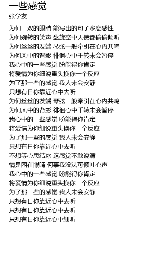| [01:41.0] | 我心中的一些感觉 盼能得你肯定 |