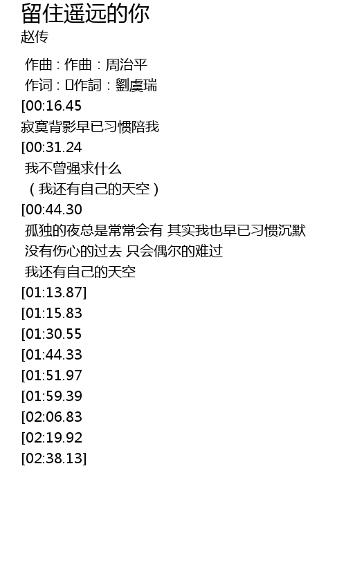 | [03:48.90][01:44.33] | 留住遥远的你 在我的天空 |