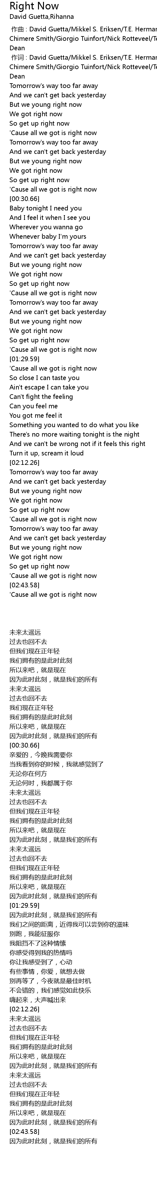 | [00:00.342] | 作词 : David Guetta/Mikkel S. Eriksen/T.E. Hermansen/Shaffer Chimere Smith/Giorgio Tuinfort/Nick Rotteveel/Terius Nash/Robyn Fenty/Esther Dean |