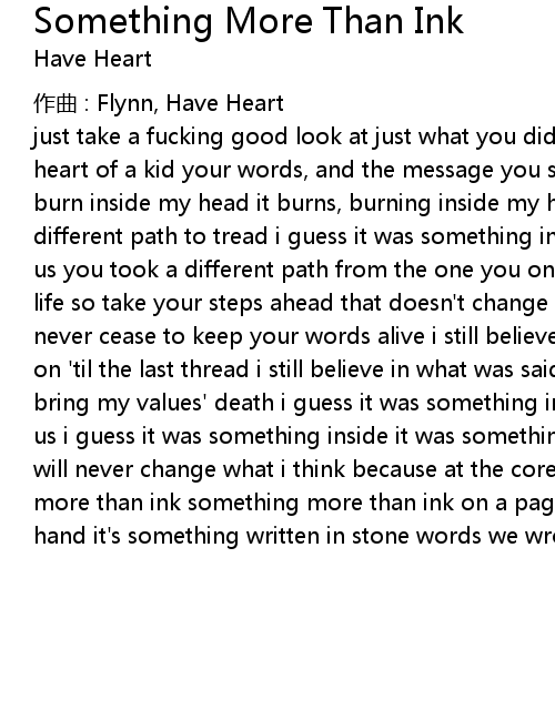 | just take a fucking good look at just what you did you set a raging fire in the heart of a kid your words, and the message you sent are held in my heart as they burn inside my head it burns, burning inside my head even if you chose a different path to tread i guess it was something inside it was something more to us you took a different path from the one you once set but that's the cycle of life so take your steps ahead that doesn't change one thing in my life i'll never cease to keep your words alive i still believe in what was said i'll hold on 'til the last thread i still believe in what was said your absence doesn't bring my values' death i guess it was something inside it was something more to us i guess it was something inside it was something more to us a "hero's fall" will never change what i think because at the core of my heart this is something more than ink something more than ink on a page, on a shirt, on the back of my hand it's something written in stone words we wrote in stone |