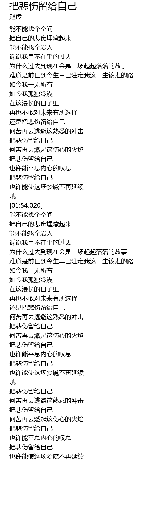 | [01:31.660] | bǎ bēi shāng liú gěi zì jǐ |