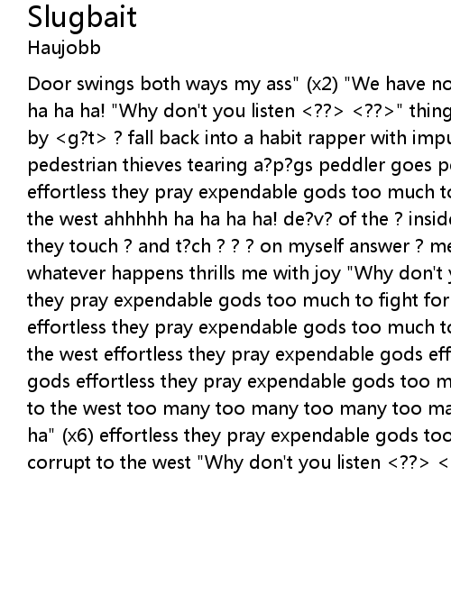 Door swings both ways my ass" (x2) "We have no weapons of any kind?" ahhhhh ha ha ha ha! "Why don't you listen <??> <??>" things tearing apart separate thought by <g?t> ? fall back into a habit rapper with impurity complex peddler goes pedestrian thieves tearing a?p?gs peddler goes pedestrian "Ha ha ha ha ha" effortless they pray expendable gods too much to fight for too many corrupt to the west ahhhhh ha ha ha ha! de?v? of the ? inside and out making holy whatever they touch ? and t?ch ? ? ? on myself answer ? me ? delicious each moment whatever happens thrills me with joy "Why don't you listen <??> <??>" effortless they pray expendable gods too much to fight for too many corrupt to the west effortless they pray expendable gods too much to fight for too many corrupt to the west effortless they pray expendable gods effortless they pray expendable gods effortless they pray expendable gods too much to fight for too many corrupt to the west too many too many too many too many corrupt to the west "Ha ha ha ha" (x6) effortless they pray expendable gods too much to fight for too many corrupt to the west "Why don't you listen <??> <??> |