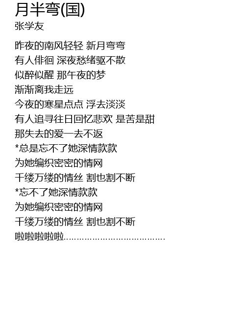 | [00:18.300] | zuó yè de nán fēng qīng qīng xīn yuè wān wān |