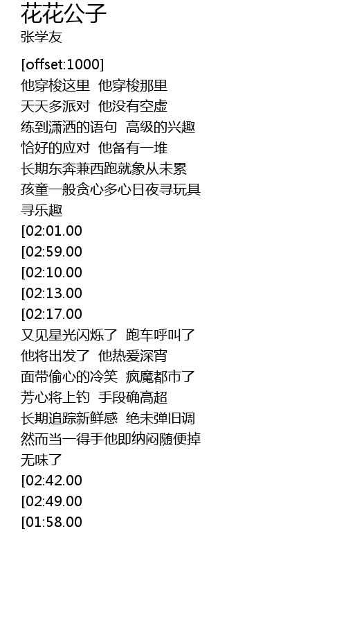 | [03:03.00][02:10.00][00:56.00] | huā huā gōng zǐ xún qiú duō duō duō |