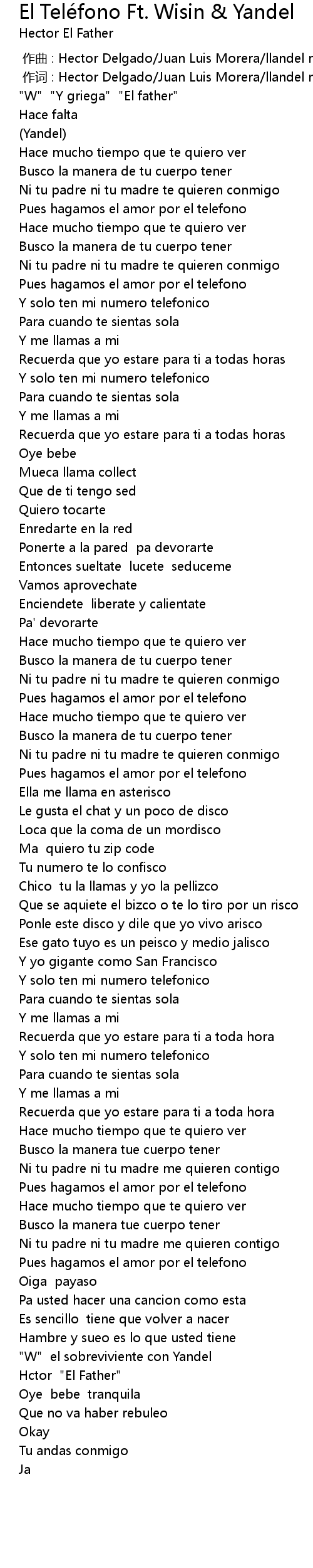 | [00:00.339] | 作词 : Hector Delgado/Juan Luis Morera/llandel malave |