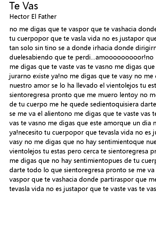 no me digas que te vaspor que te vashacia donde partiraspor que me dejasnecesito tu cuerpopor que te vasla vida no es justapor que te vaste vas te vas..me siento tan solo sin tino se a donde irhacia donde dirigirmesabiendo que te perdiy como duelesabiendo que te perdi...amooooooooor!no me digas que te vaste vas te vasno me digas que te vaste vas te vasno me digas que este amorque un dia me hiciste jurarno existe ya!no me digas que te vasy no me digas que no hay sentimientoque nuestro amor se lo ha llevado el vientolejos tu estas pero cerca te sientoregresa pronto que me muero lentoy no me digas que no hay sentimientopues de tu cuerpo me he quede sedientoquisiera darte todo lo que sientoregresa pronto se me va el alientono me digas que te vaste vas te vasno me digas que te vaste vas te vasno me digas que este amorque un dia me hiciste jurarno existe ya!necesito tu cuerpopor que tevasla vida no es justapor que te vaste vas te vasy no me digas que no hay sentimientoque nuestro amor se lo ha llevado el vientolejos tu estas pero cerca te sientoregresa pronto que me muero lentoy no me digas que no hay sentimientopues de tu cuerpo me he quede sedientoquisiera darte todo lo que sientoregresa pronto se me va el alientono me digas que te vaspor que te vashacia donde partiraspor que me dejasnecesito tu cuerpopor que tevasla vida no es justapor que te vaste vas te vas
