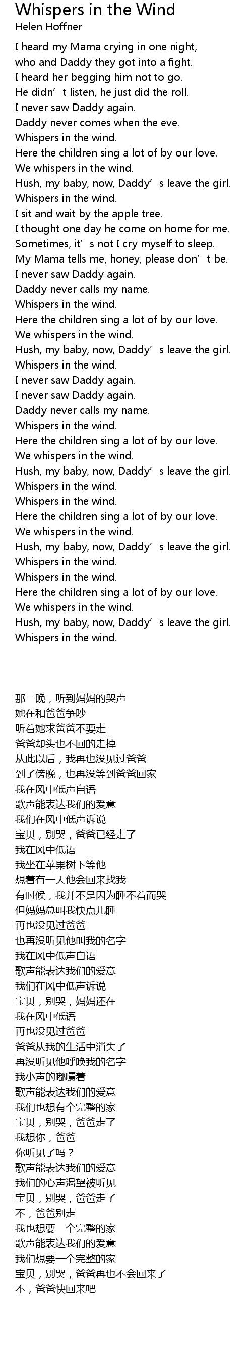 | [2:39.872] | Hush, my baby, now, Daddy’s leave the girl. |