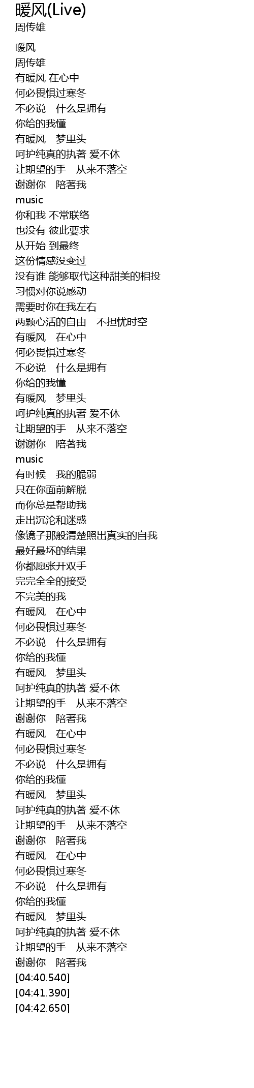 | [04:08.520] | yǒu nuǎn fēng zài xīn zhōng |