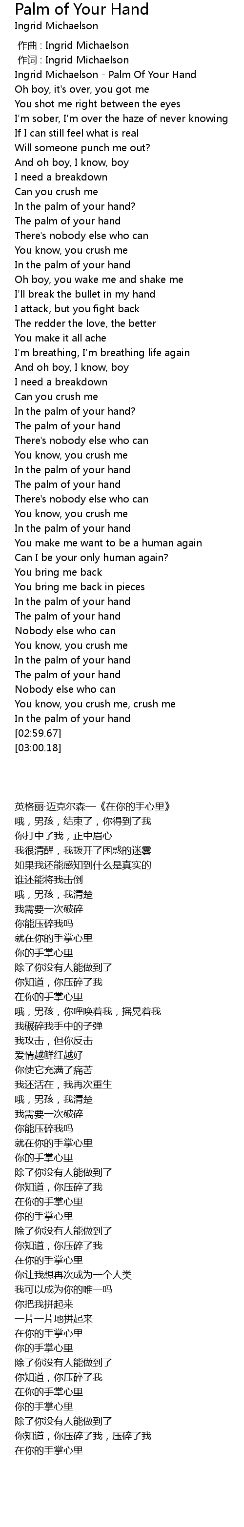 | [00:01.00] | Ingrid Michaelson Palm Of Your Hand |