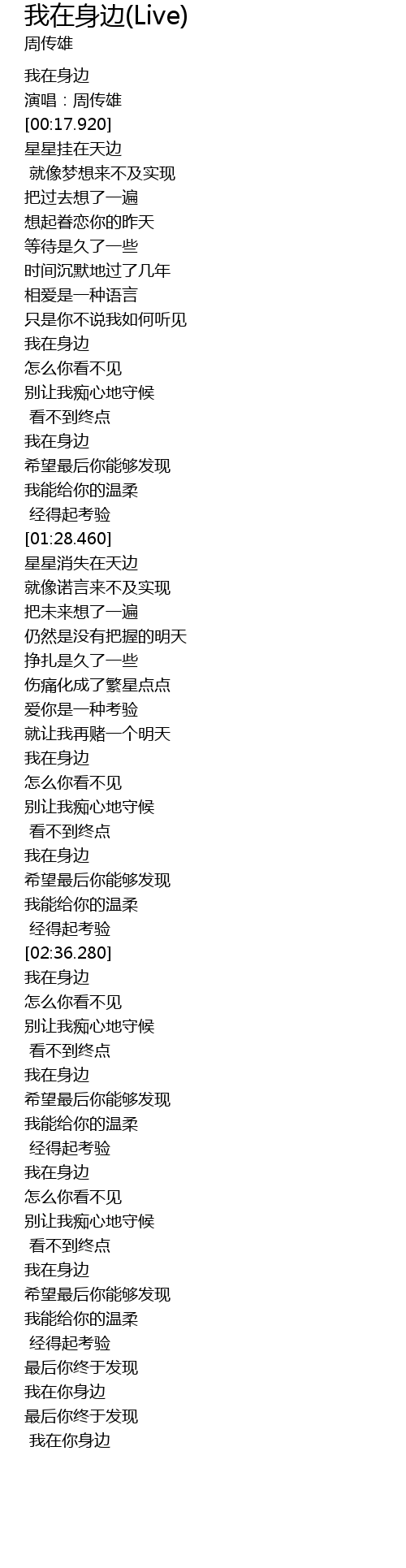 | [04:03.850] | wǒ zài nǐ shēn biān |