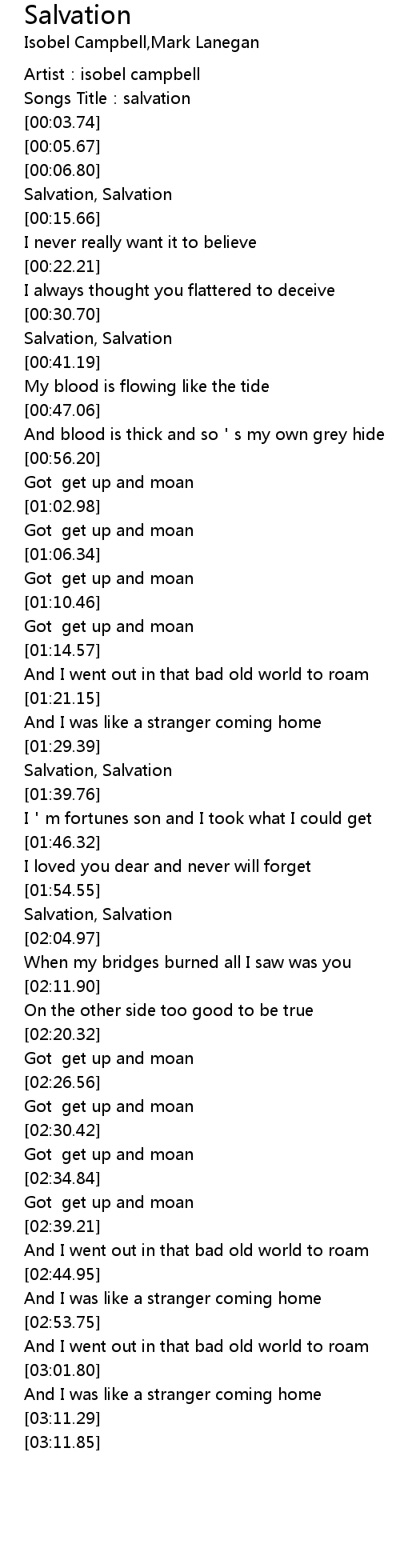 | [00:34.32] | Salvation, Salvation |