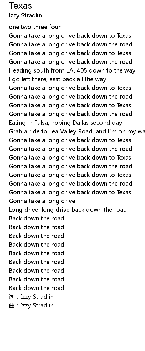 | [00:49.47] | Gonna take a long drive back down to Texas |