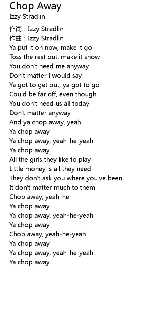 | [03:10.85] | Chop away, yeahheyeah |