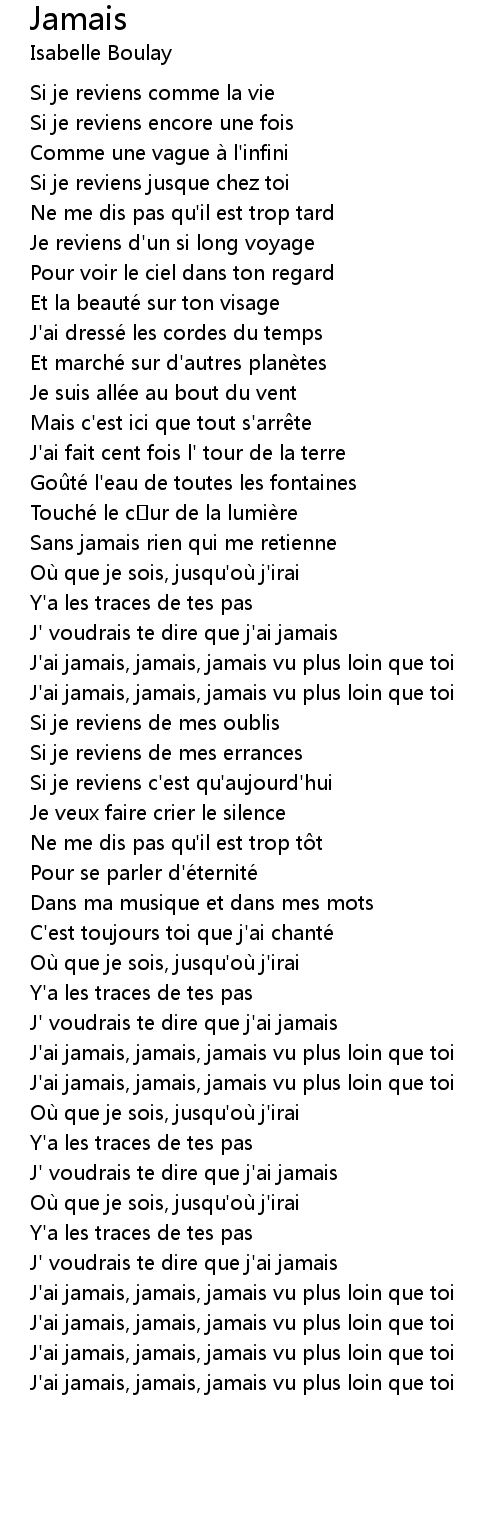 | J' ai jamais, jamais, jamais vu plus loin que toi | |