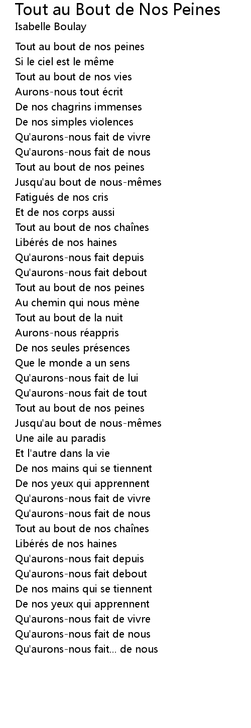| Song | Tout au Bout de Nos Peines |