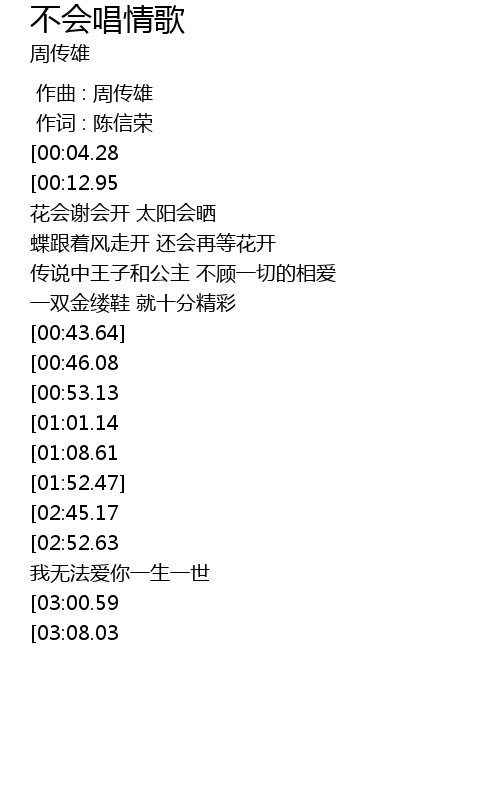 | [03:58.81][00:04.28] | 周传雄:不会唱情歌 |