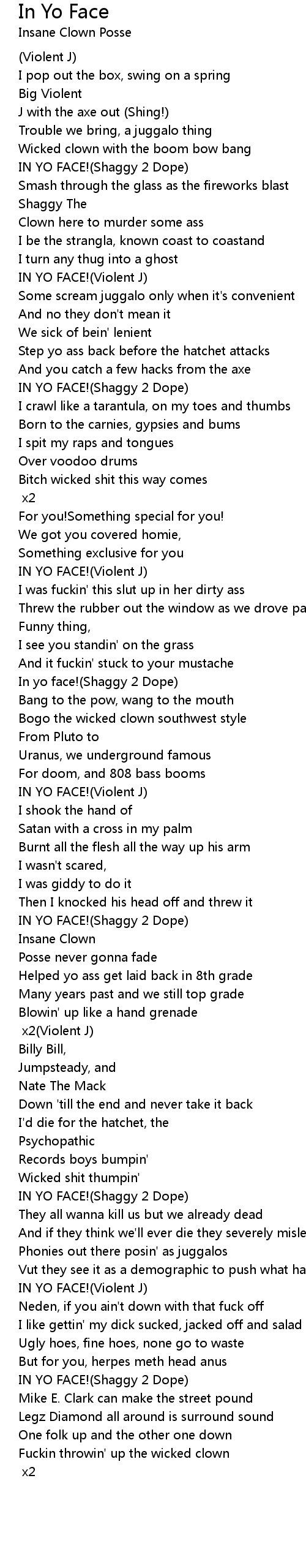 IN YO FACE![Chorus] x2(Violent J) |