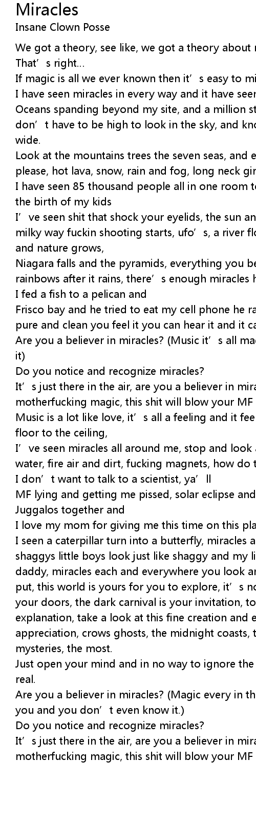 | I seen a caterpillar turn into a butterfly, miracles aint nothing to lye, shaggys little boys look just like shaggy and my little boy looks just like daddy, miracles each and everywhere you look and nobody has to stay where they put, this world is yours for you to explore, it' s nothing but miracles beyond your doors, the dark carnival is your invitation, to witness that of there our explanation, take a look at this fine creation and enjoy it better with appreciation, crows ghosts, the midnight coasts, the wonders of the world, mysteries, the most. | |