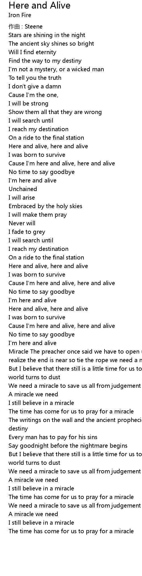 | Miracle The preacher once said we have to open up our eyes find a way, make all realize the end is near so tie the rope we need a miracle, it's our only hope | |
