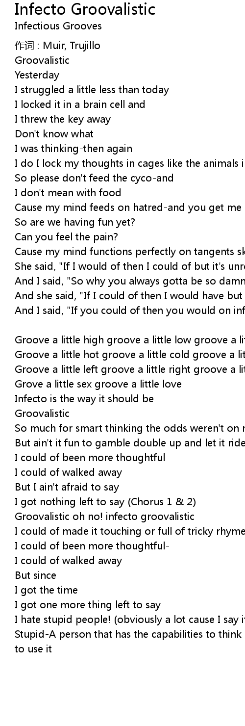| And I said, "If you could of then you would on infecto groovalistic" (Chorus 2:) | |