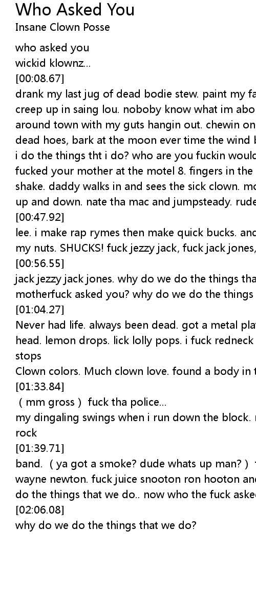 | [00:38.86] | shake. daddy walks in and sees the sick clown. movin his buttcheeks |