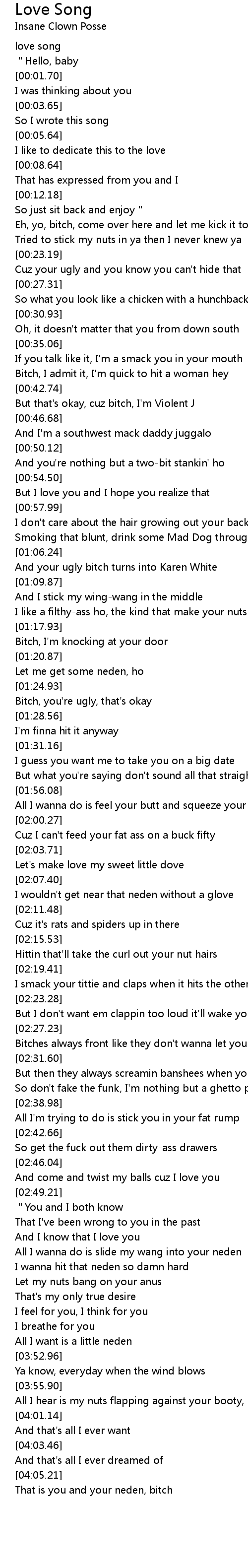 | [03:56.77] | All I hear is my nuts flapping against your booty, ho |