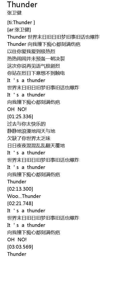 | [00:00.678] | Thunder shì jiè mò rì jiù rì jiù mèng jiù shì jiù huà yě bào zhà |