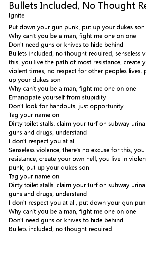 | Bullets included, no thought required, senseless violence, there' s no excuse for this, you live the path of most resistance, create your own hell, you live in violent times, no respect for other peoples lives, put down your gun punk, put up your dukes son | |