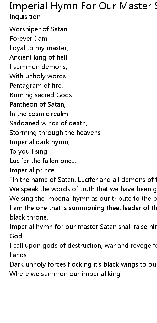 Imperial hymn for our master Satan shall raise him high far above the tears of God. |